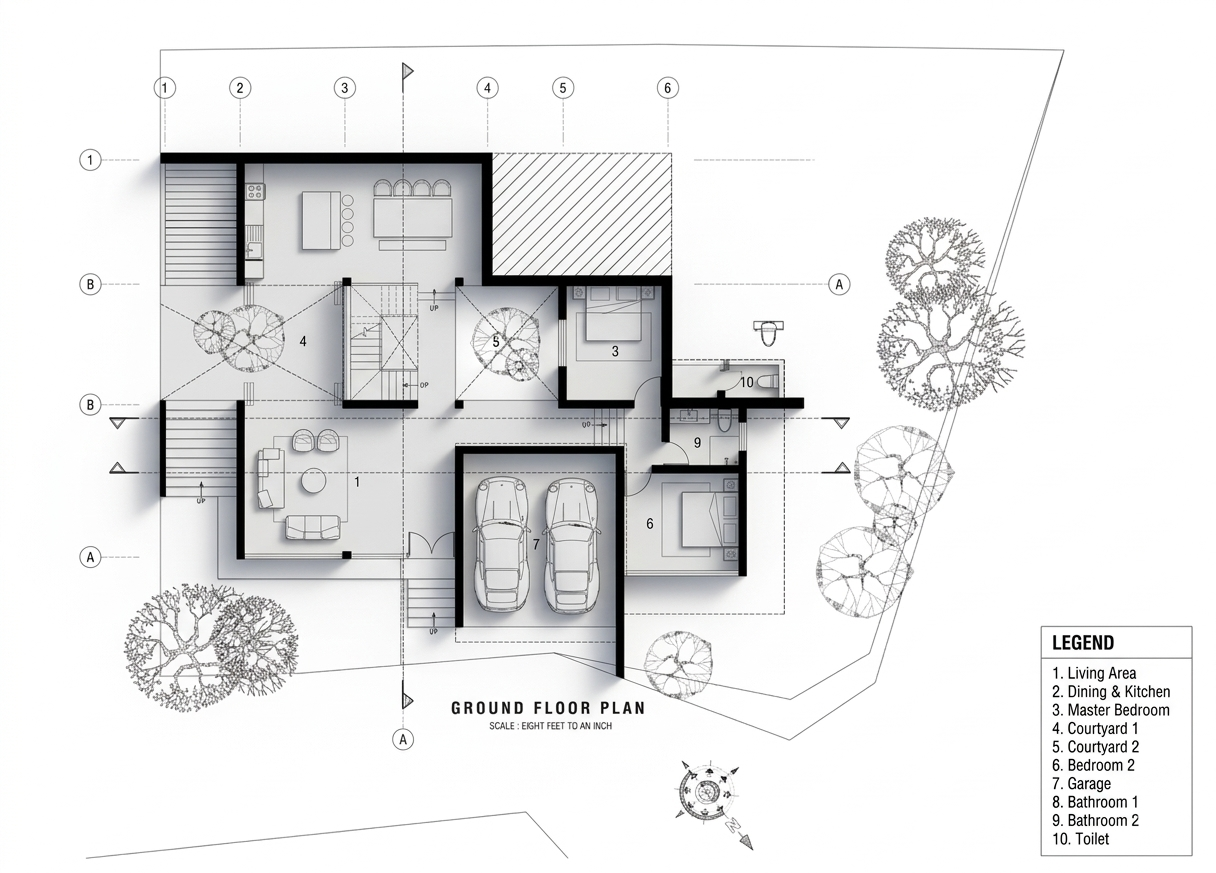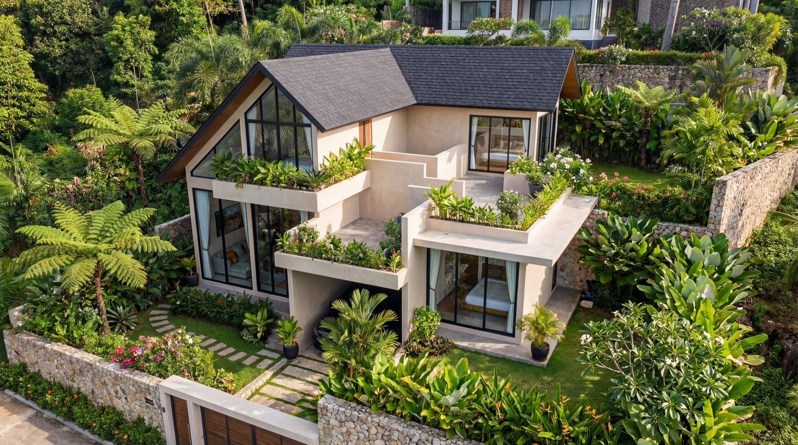 - Luxury Living: The villa features high-end amenities, including a designer kitchen, a double-height living area for natural ventilation, and private balconies for every room.